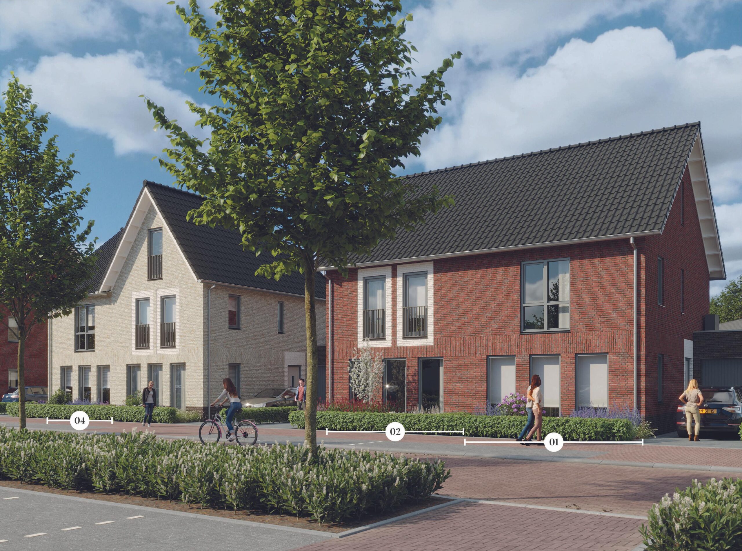 Deze nieuwbouwhuizen krijgen allemaal een garage, drie slaapkamers en een zolder. Het woonoppervlak varieert van 118 tot 123 m2. De tuinen komen op het zuidoosten en het perceeloppervlak varieert van 198 tot 230 m2. Onderling zit er wat verschil in de tweekappers, bijvoorbeeld qua steenkleur, gespiegelde indeling en positie van de kap.
