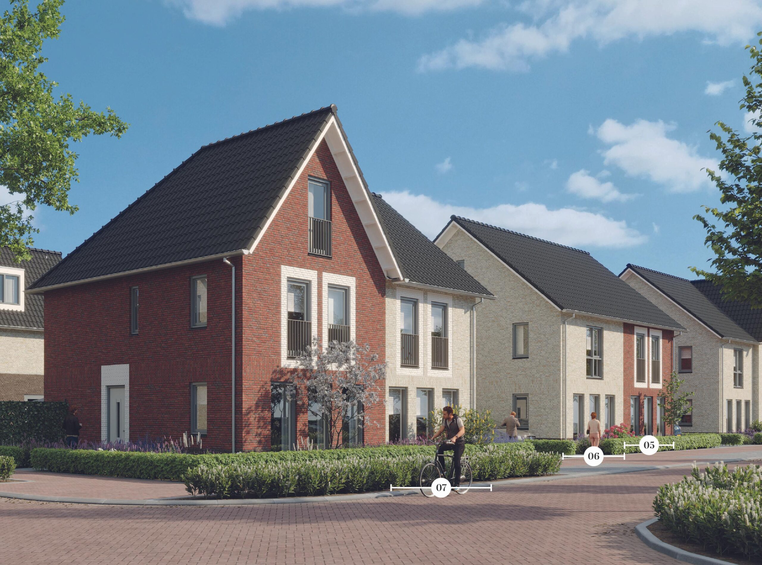 Deze nieuwbouwhuizen krijgen allemaal een garage, drie slaapkamers en een zolder. Het woonoppervlak varieert van 118 tot 123 m2. De tuinen komen op het zuidoosten en het perceeloppervlak varieert van 198 tot 230 m2. Onderling zit er wat verschil in de tweekappers, bijvoorbeeld qua steenkleur, gespiegelde indeling en positie van de kap.